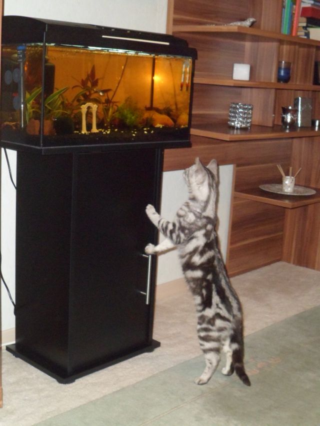 Рыбок не трогает-они закрыты сверху крышкой.А так бы трогал.Смотреть любит на них.